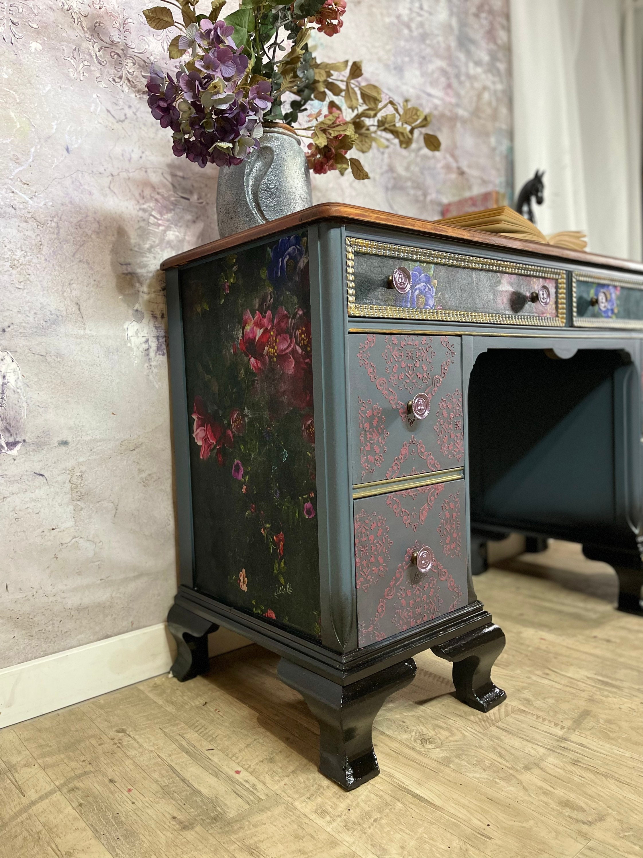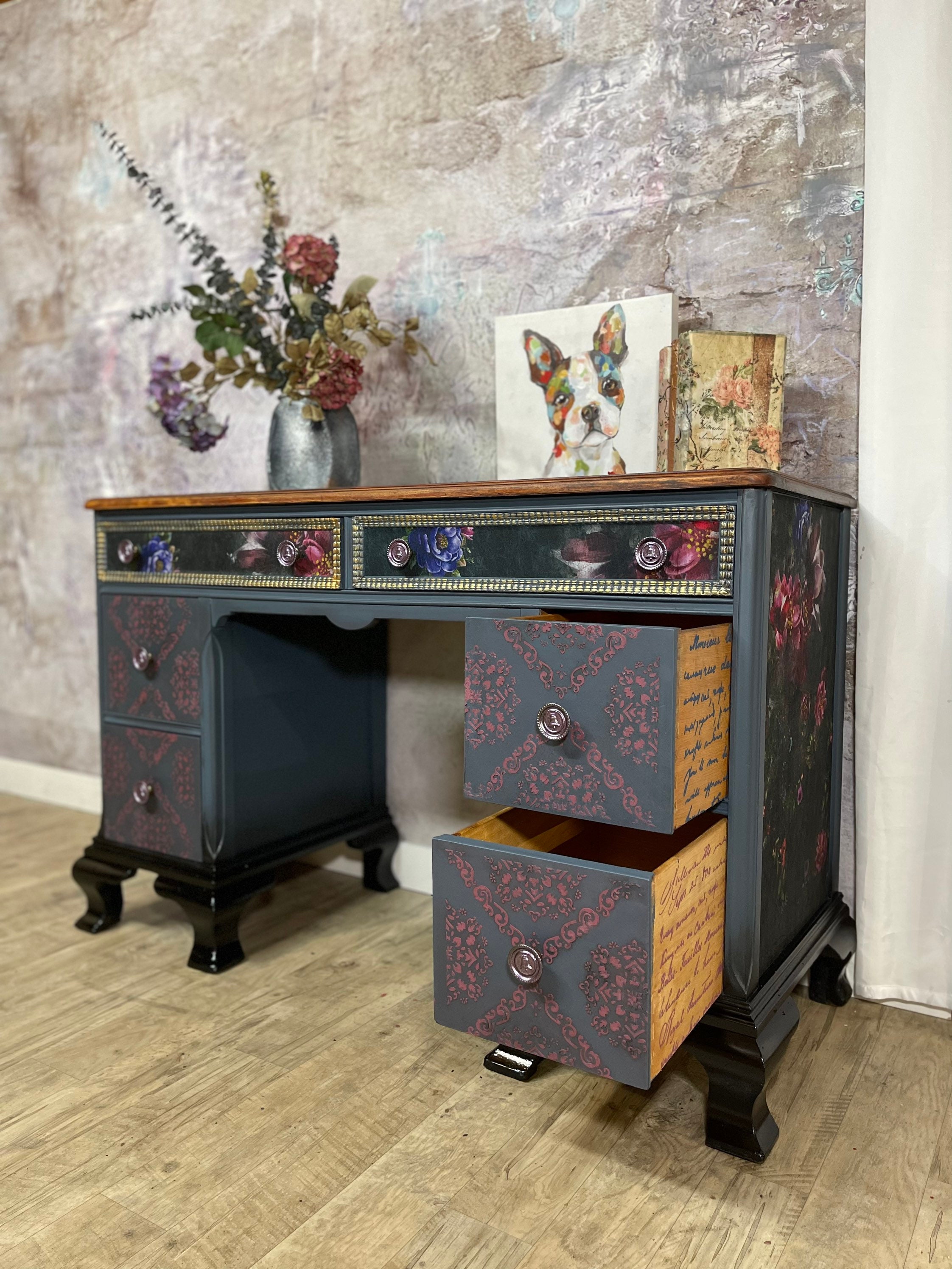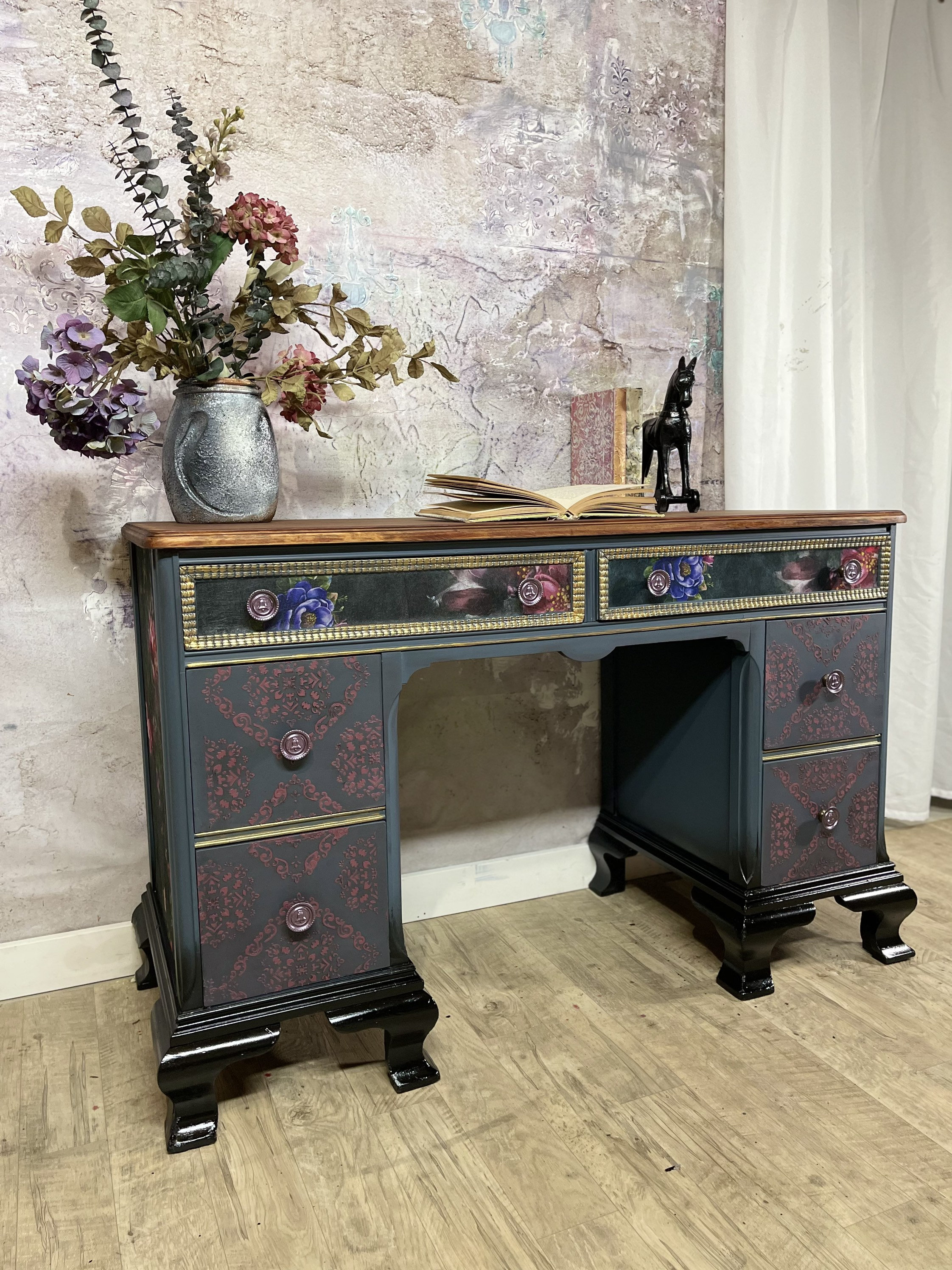 Beautifully Pianted Desk/Vanity with Decoupage paper on the sides - raised stencils on the front and inside wall of the drawers. Stained Wood Top - Drawer Liners - Painted in a blue black and accented with gold. If you would like this for a vanity instead of a desk I have a mirror to match ( please message me ).