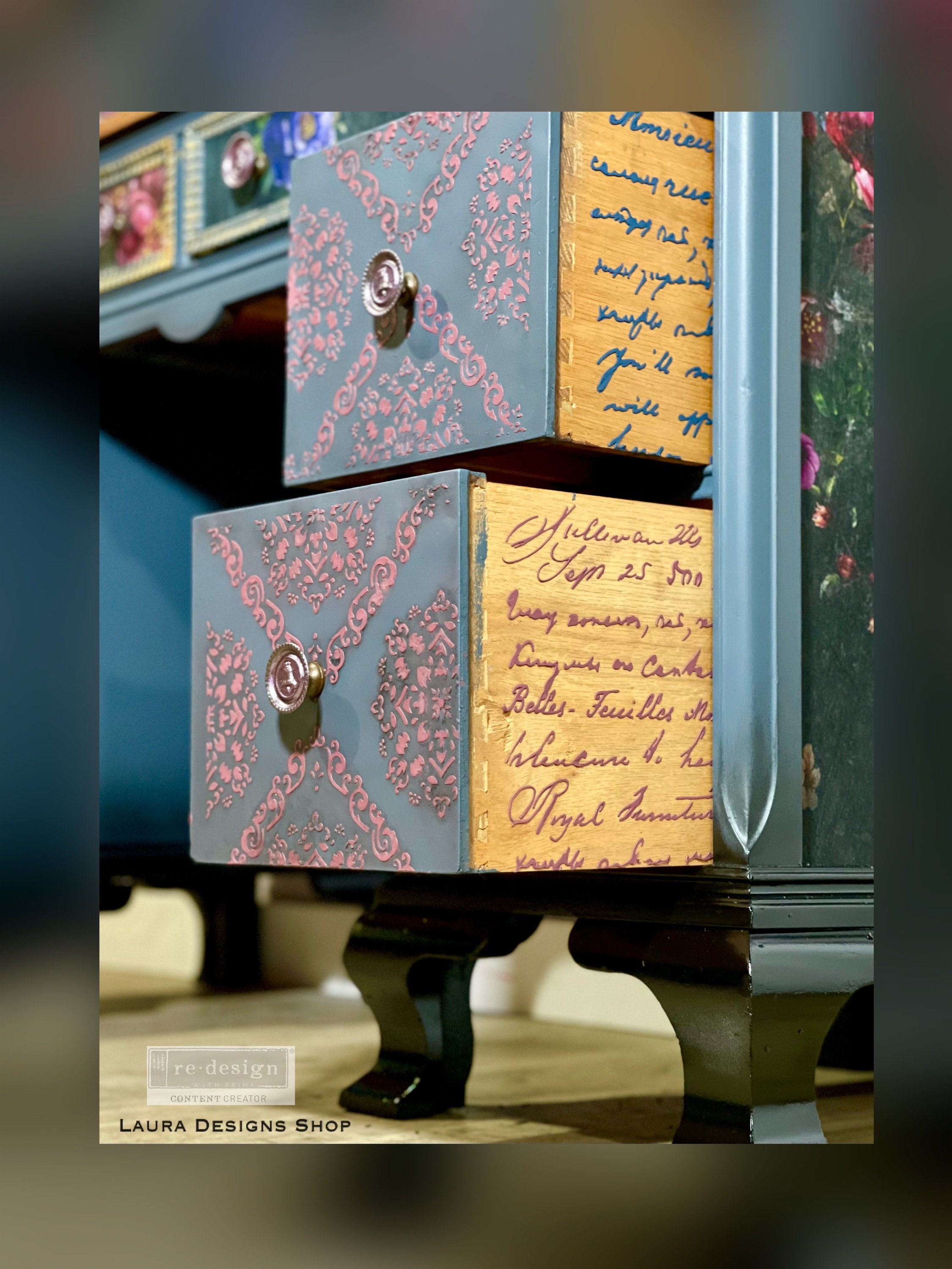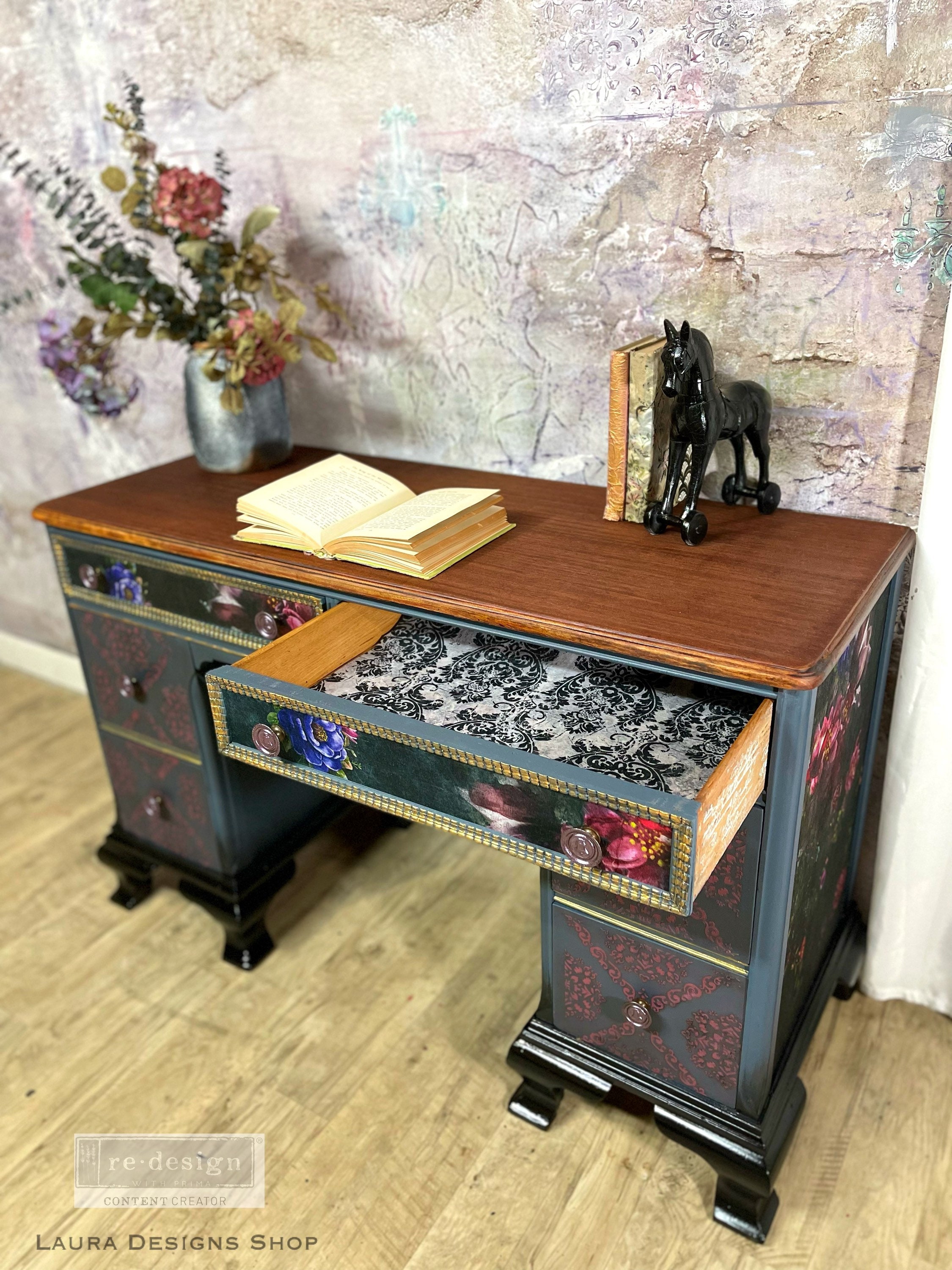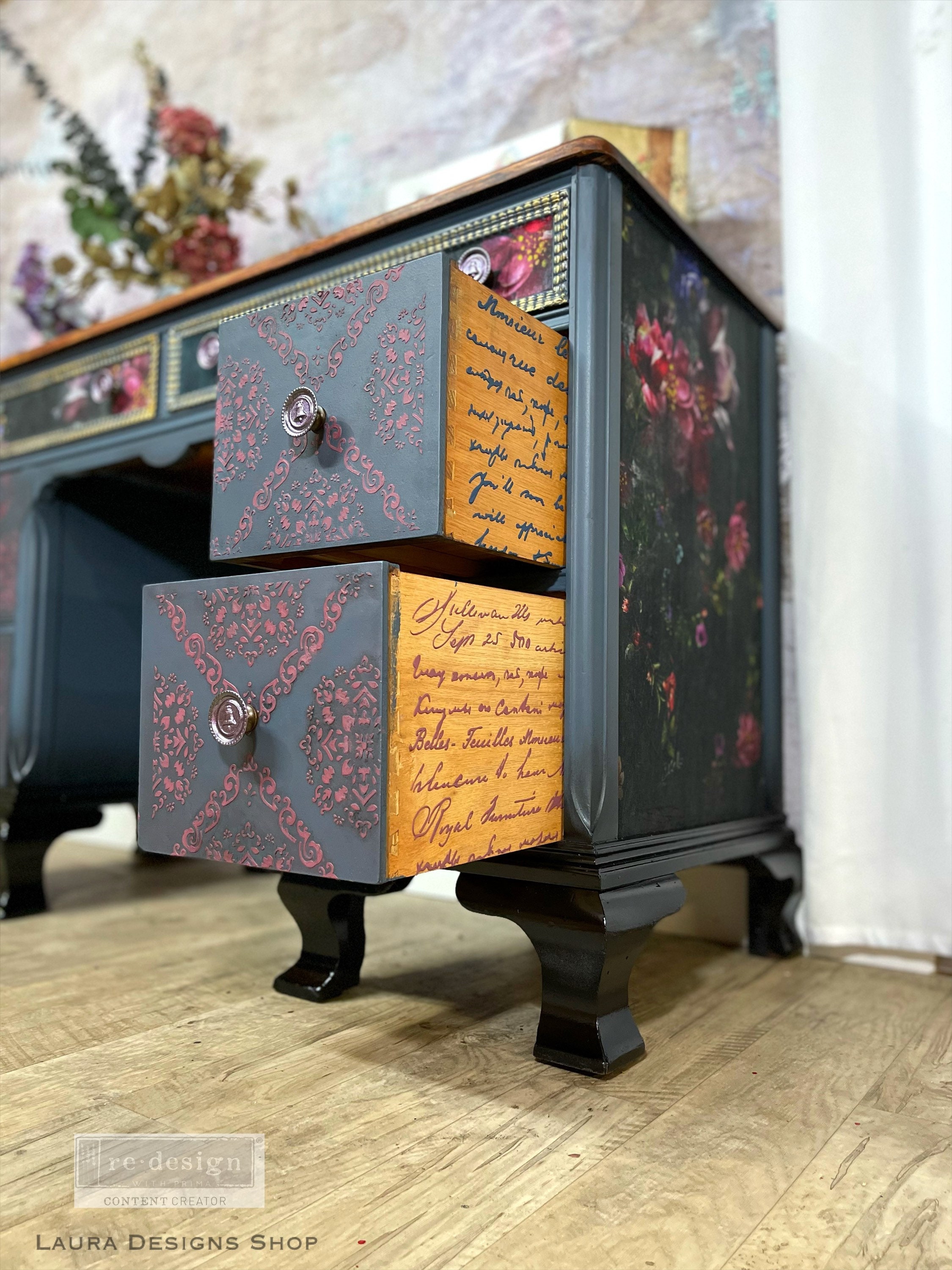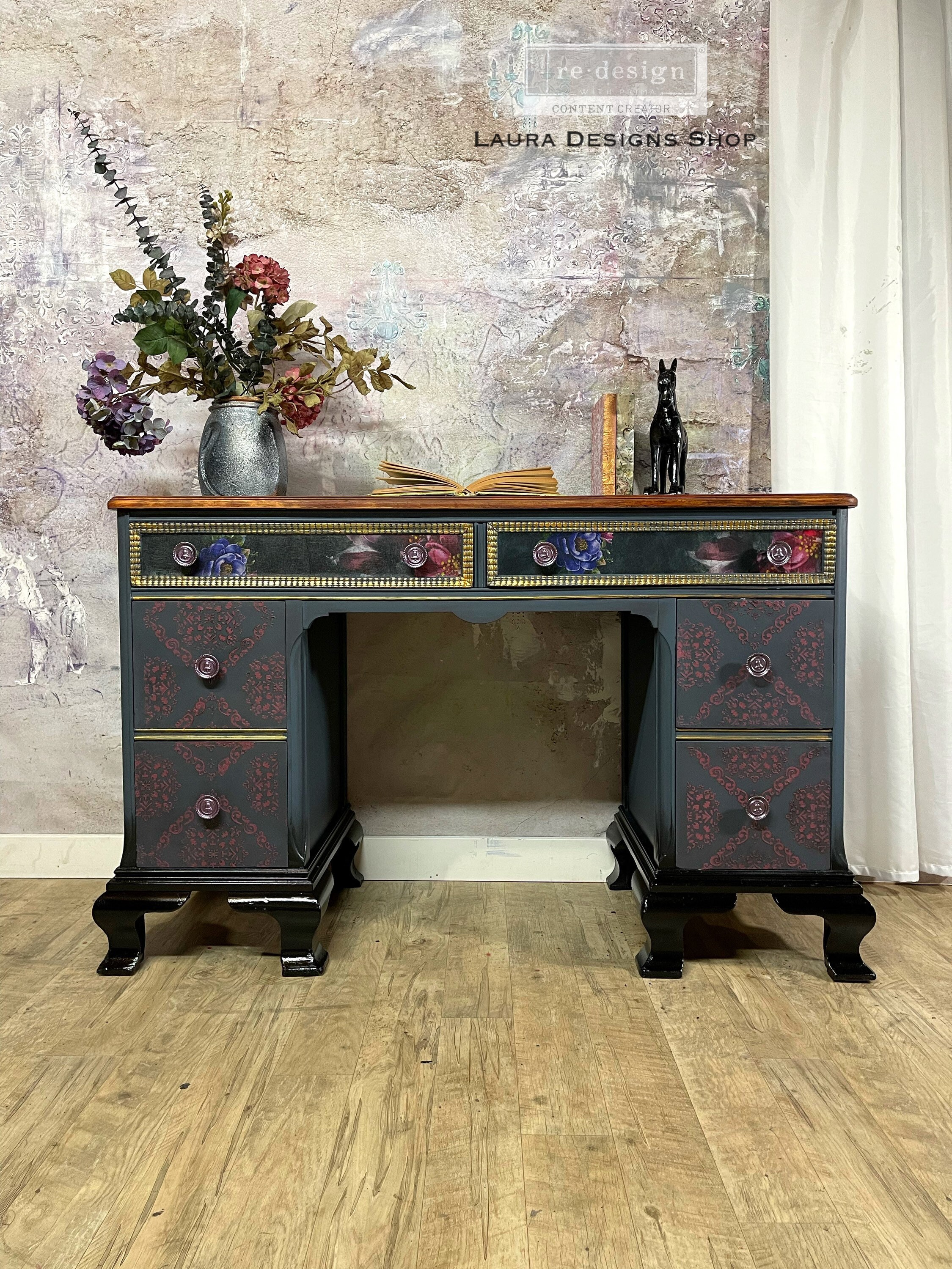 Beautifully Pianted Desk/Vanity with Decoupage paper on the sides - raised stencils on the front and inside wall of the drawers. Stained Wood Top - Drawer Liners - Painted in a blue black and accented with gold. If you would like this for a vanity instead of a desk I have a mirror to match ( please message me ).
