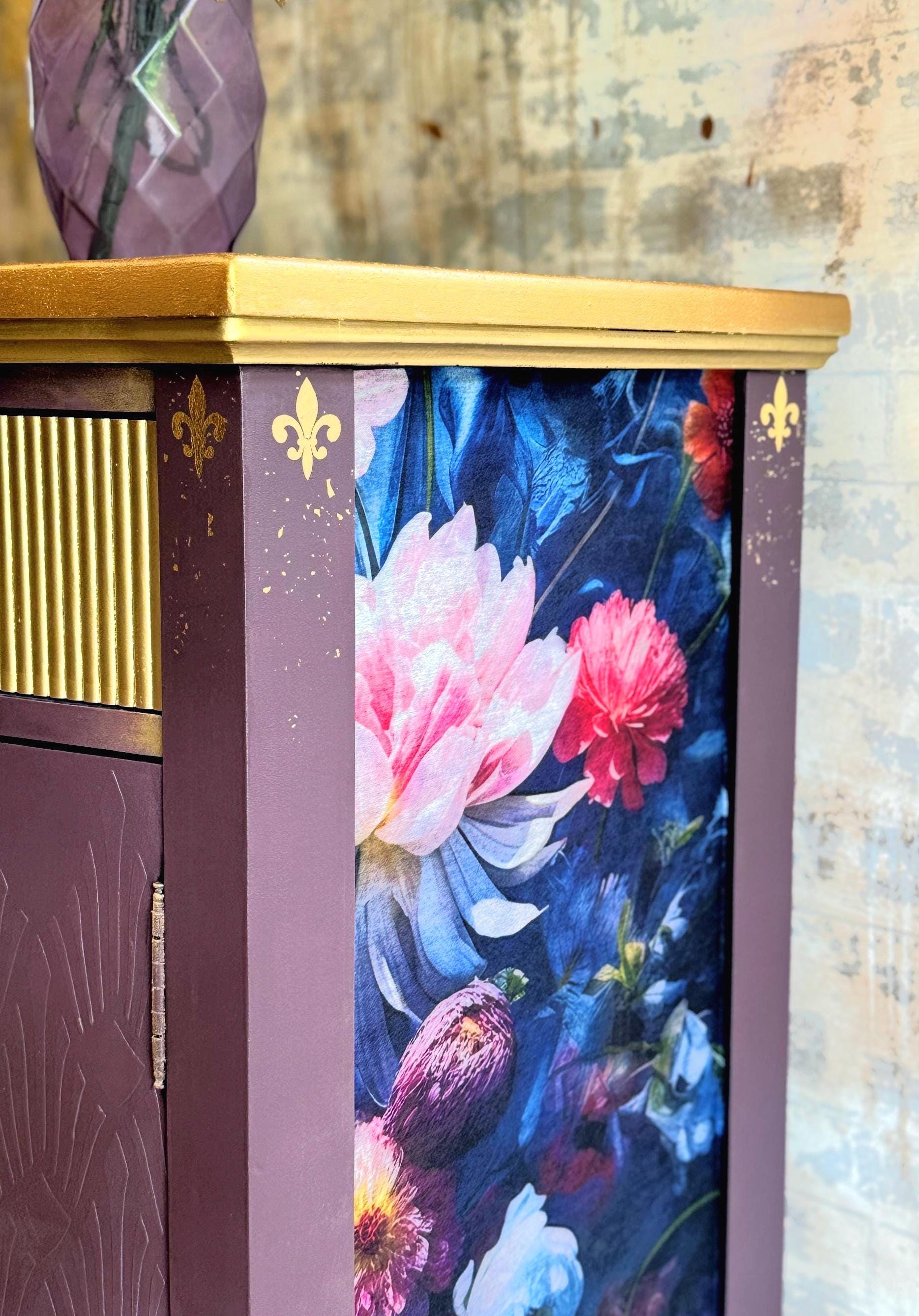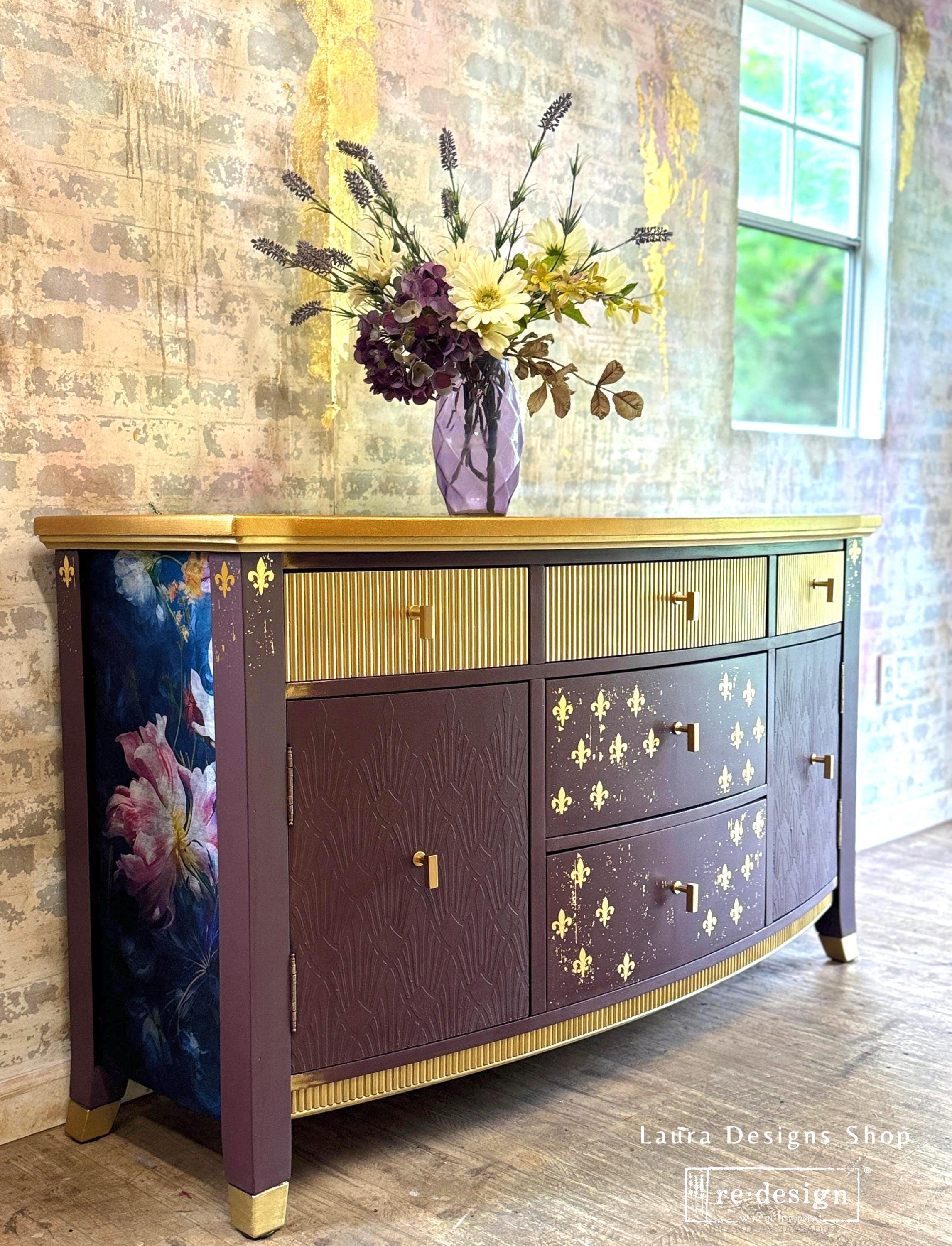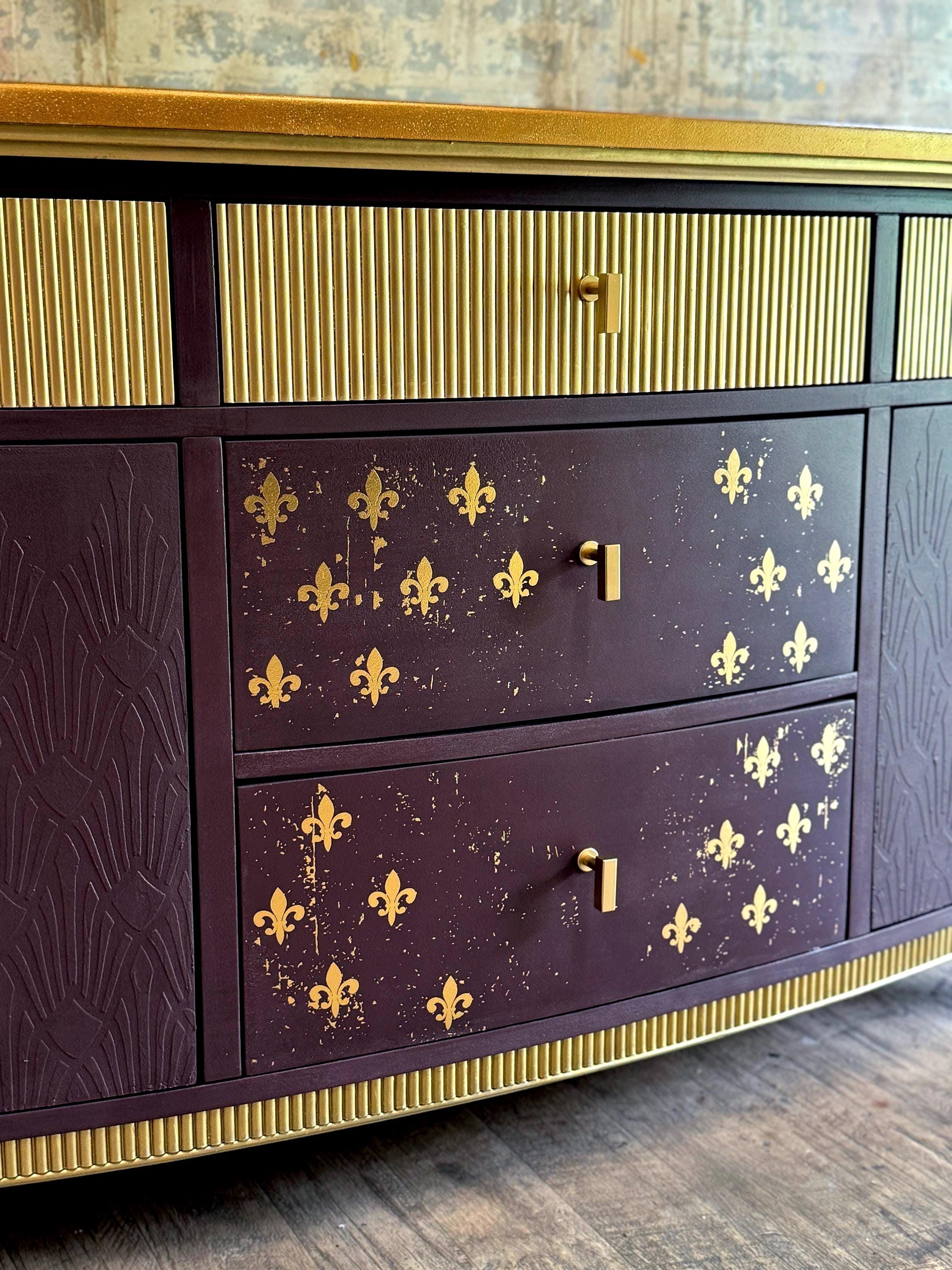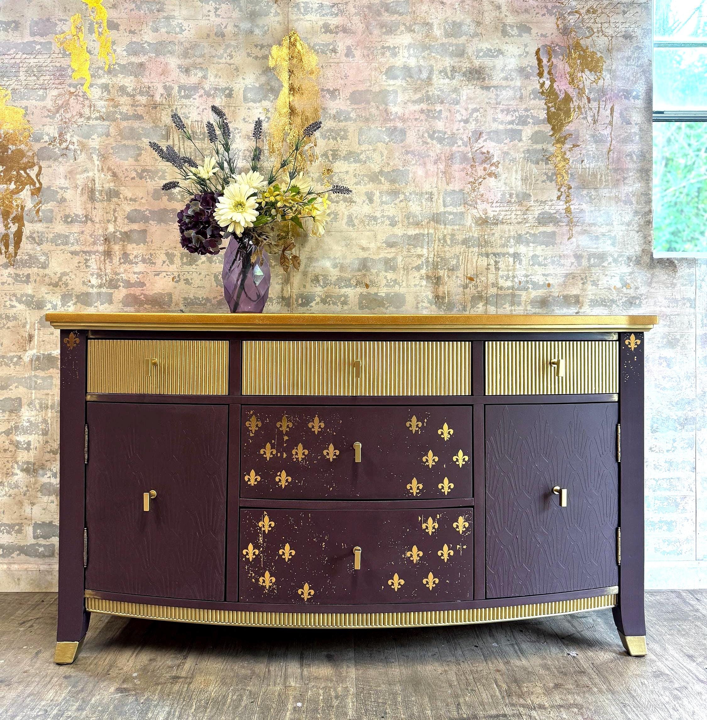 I painted this dresser daydreamapothecary paint with gold accents. Two doors open up too 2 shelves. light gold texture on the top.